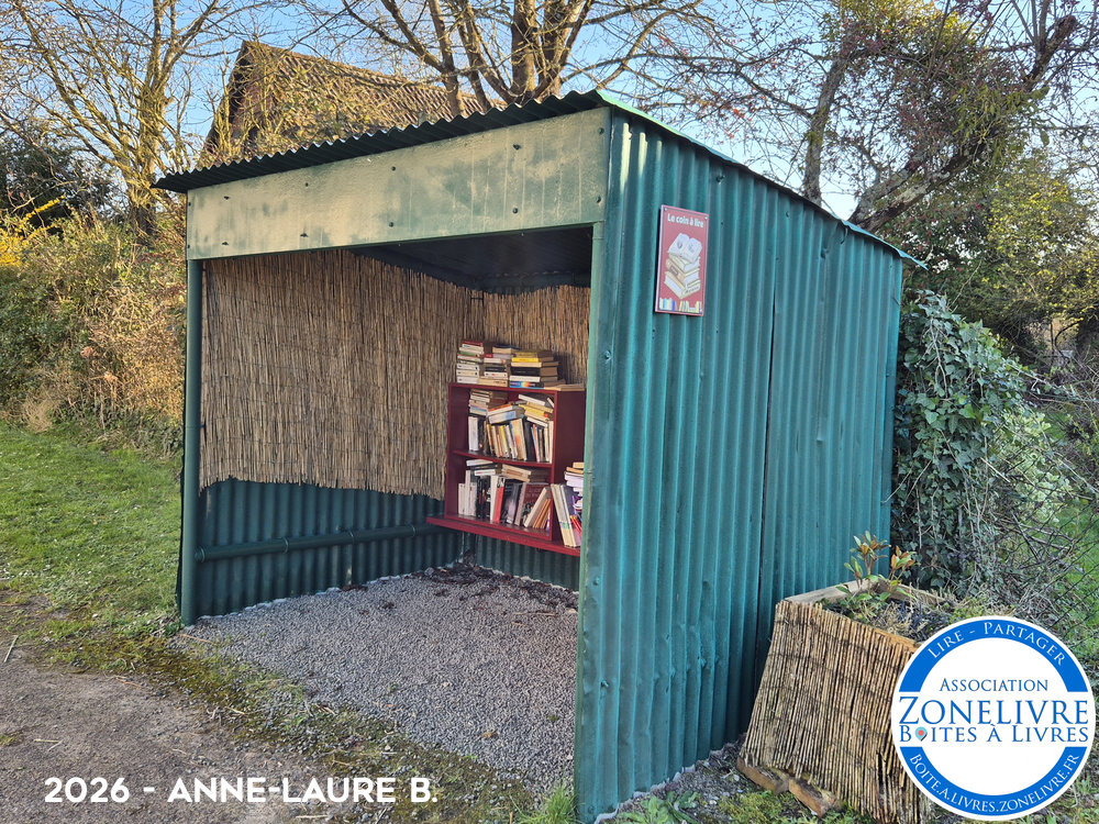 Boîte à livres « Le Coin à Lire » située dans un ancien abri bus à l’entrée du chemin entre le 8 et le 10 de la rue.
