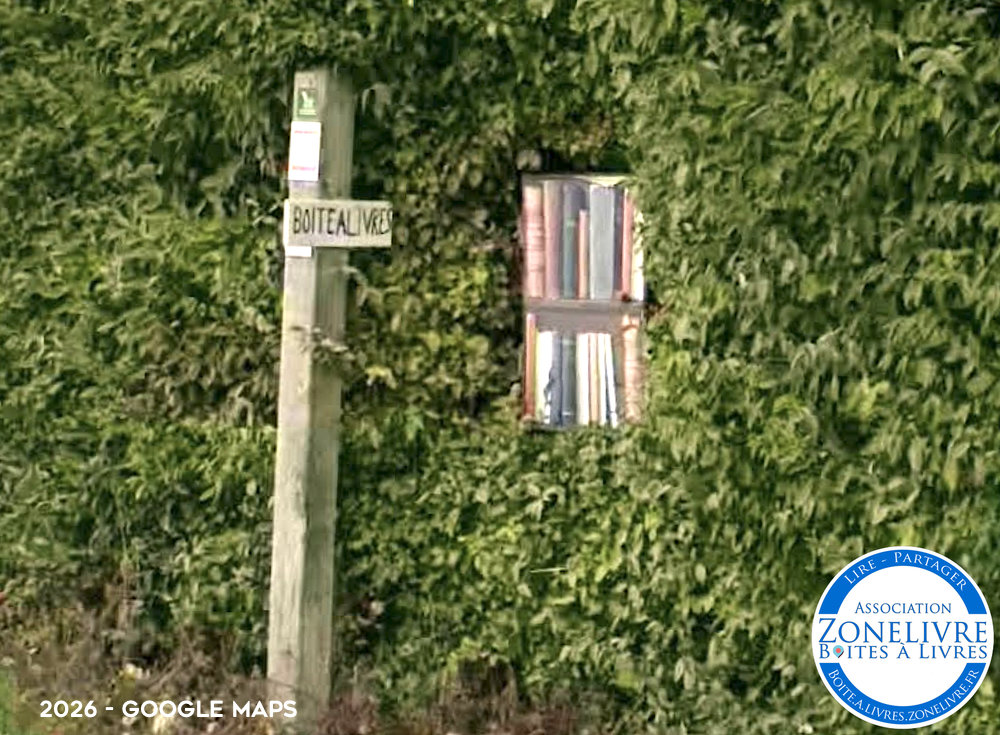 Boîte à livres située dans la haie, à l’intersection de Vieille Rue