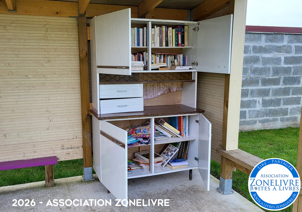 Boîte à livres située sur l’espace vert, face au terrain de football.