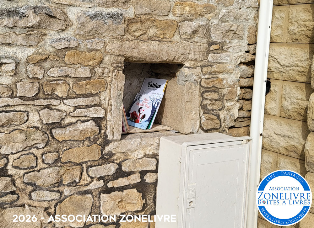 Boîte à livres située dans un espace dans le mu. à coté des places de parking de la mairie