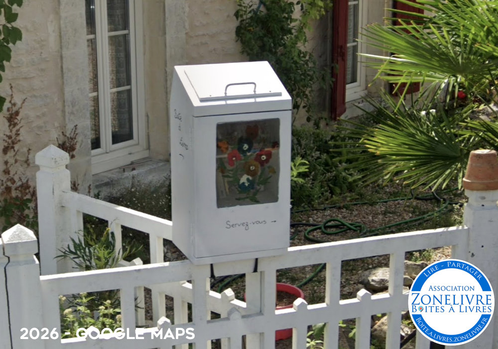 Boîte à livres située près du passage à niveau, au droit de l’ancienne gare, sur la clôture de la maison.
