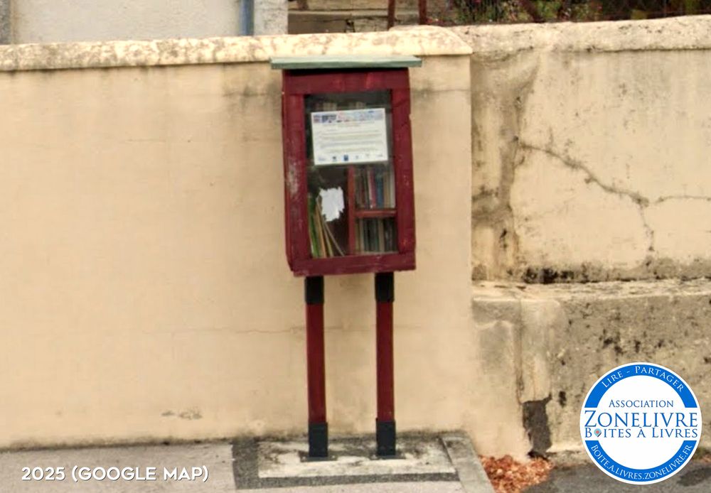 Boîte à livre située sur le trottoir au début de la rue